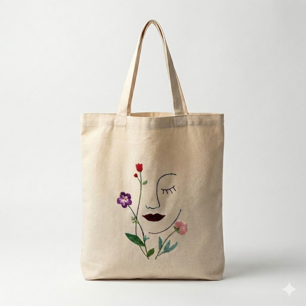 A Ecobag Silêncio da Floresta reúne um rosto suave cercado por flores bordadas à mão, criando uma sensação de calma e presença. O desenho reflete a serenidade da natureza e o cuidado das bordadeiras, que transformam cada ponto em expressão de beleza.